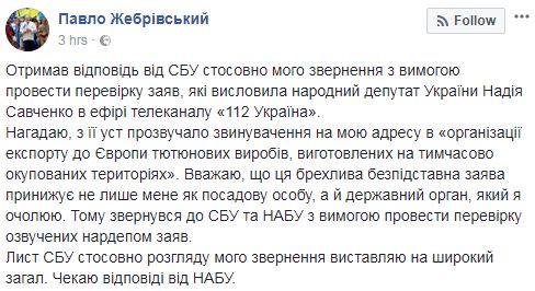 Председатель Донецкой областной военно-гражданской администрации Павел Жебривский рассказал о том, что он обратился в Службу безопасности Украины и Национальное антикоррупционное бюро с просьбой провести проверку в отношении депутата Верховной Рады Надежды Савченко. Об этом он написал на странице в Facebook.