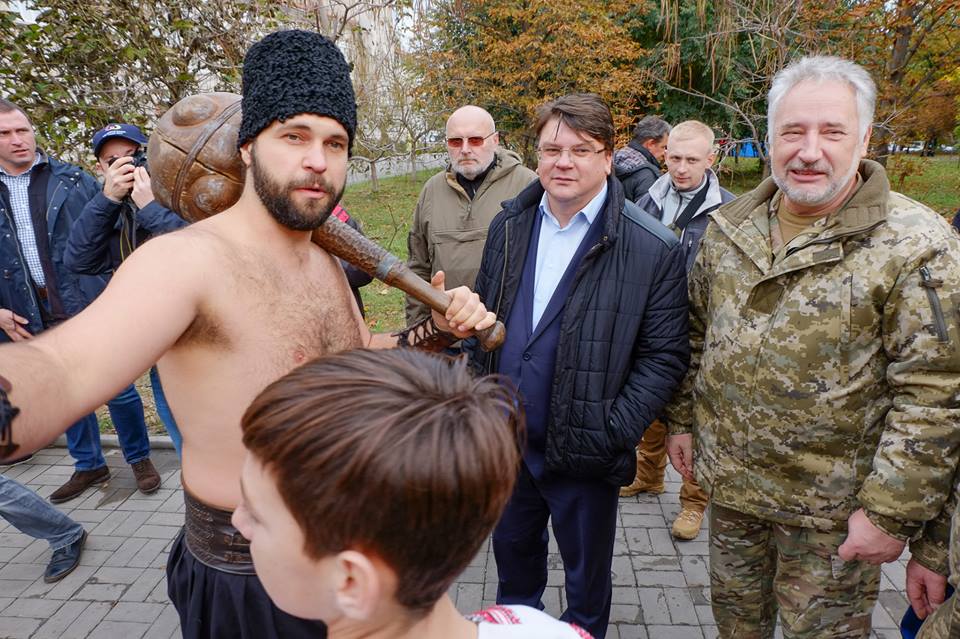 17:30  Официозное празднество в Бахмуте (бывший Артемовск Донецкой области). Донецкий губернатор Жебривский, министр спорта Жданов и полуодетый человек.
