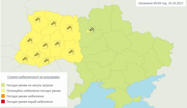 Как сообщала "Страна", в 10 областях Украины объявлено штормовое предупреждение на пятницу и субботу. Так, до конца суток 13 октября и 14 октября в Волынской, Ровненской, Львовской, Тернопольской, Хмельницкой, Ивано-Франковской, Закарпатской, Черновицкой, Житомирской и Винницкой областях порывы ветра 15-20 м/с.
