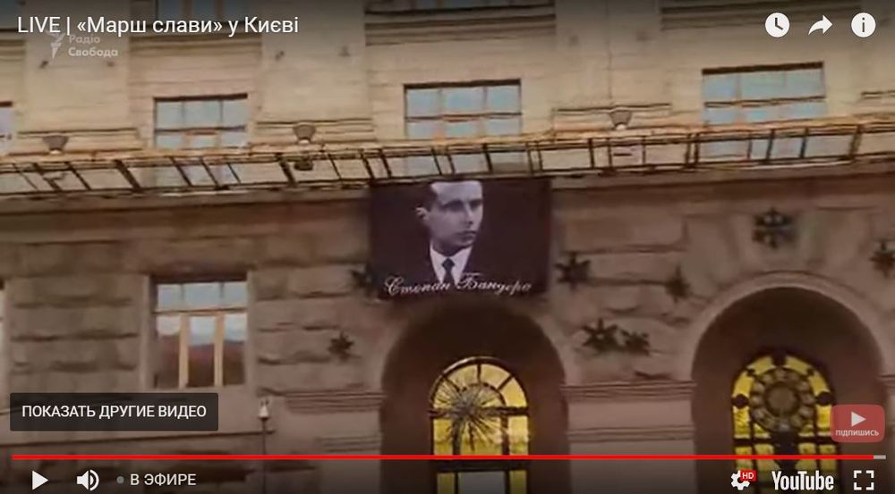 На мэрии тем временем повесили огромный баннеры с изображением лидеров ОУН-УПА Степана Бандеры и Романа Шухевича.