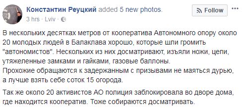 Ранее сегодня в соцсетях сокоординатор фонда "Восток-SOS" Константин Реуцкий разместил фото, на которых полиция, по его словам, осматривают людей возле здания "Автономного сопротивления" во Львове.