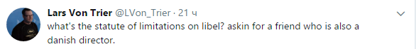 В своём комментарии фон Триер, также как и певица, не стал упоминать конкретных личностей. "Каков срок давности в отношении клеветы? Спрошу у друга, который также является датским режиссёром", - написал он в своём микроблоге в Twitter.