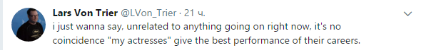 "Есть такая вещь, как режиссёрская методика, вы знаете?.. Я просто хочу сказать, безотносительно к чему-либо происходящему сейчас, это не случайно, что "мои актрисы" показали у меня лучшие результаты в своей карьере", - отметил фон Триер.