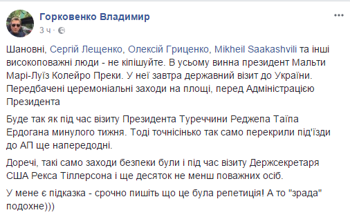 "Всему виной президент Мальты Мари-Луиз Колейро Преко. У нее завтра государственный визит в Украину. Предусмотрены церемониальные мероприятия на площади перед Администрацией Президента. Будет так как во время визита Президента Турции Реджепа Тайипа Эрдогана на прошлой неделе. Тогда точно так же перекрыли подъезды к АП еще накануне. Кстати, такие же меры безопасности были и во время визита госсекретаря США Рекса Тиллерсона и еще десятка не менее важных персон. У меня есть подсказка - срочно пишите что это была репетиция! А то "измена" подохнет", - сыронизировал Горковенко.
