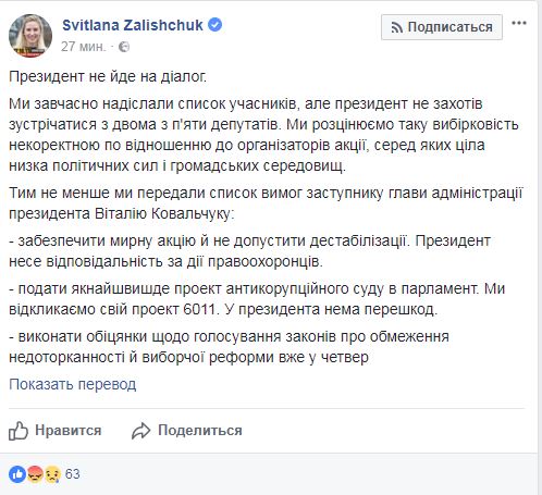 21.07 Прибывшие в Администрацию президента народные депутаты с МихоМайдана передали первому замглавы Администрации президента Виталию Ковальчуку список требований. Об этом сообщила нардеп Светлана Залищук на своей странице в Facebook.