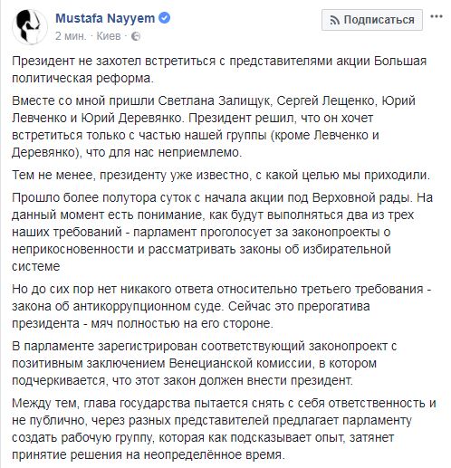 19:46  Мустафа Найем написал о встрече с президентом. Туда пошли трое нардепов: сам Найем, Светлана Залищук и Юрий Левченко - свободовец, бросивший дымовую шашку в Раде.