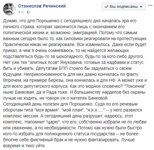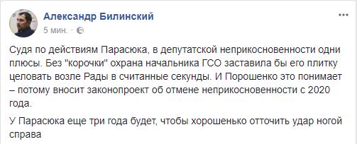 "Судя по действиям Парасюка, в депутатской неприкосновенности одни плюсы. Без "корочки" охрана начальника ГСО заставила бы его плитку целовать возле Рады в считанные секунды. И Порошенко это понимает – потому вносит законопроект об отмене неприкосновенности с 2020 года", - пишет в Facebook журналист Александр Билинский.