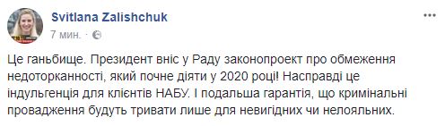 "Это позорище. Президент внес в Раду законопроект об ограничении неприкосновенности, который начнет действовать в 2020 году! На самом деле это индульгенция для клиентов НАБУ. И дальнейшая гарантия, что уголовные производства будут продолжаться только для невыгодных или нелояльных" - пишет нардеп от БПП Светлана Залищук.