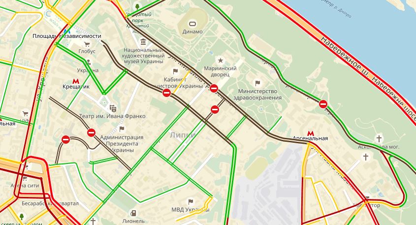 9:17  Утренний Киев. "Кирпичами" обозначены перекрытые из-за акций дороги. В городе сейчас 7-балльные пробки.