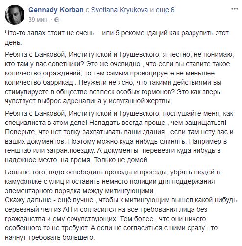 "Ребята с Банковой, Институтской и Грушевского, я честно, не понимаю, кто там у вас советники? Это же очевидно , что если вы ставите такое количество ограждений, то тем самым провоцируете не меньшее количество баррикад . Неужели не ясно, что такими действиями вы стимулируете в обществе всплеск особых гормонов? Это как зверь чувствует выброс адреналина у испуганной жертвы".