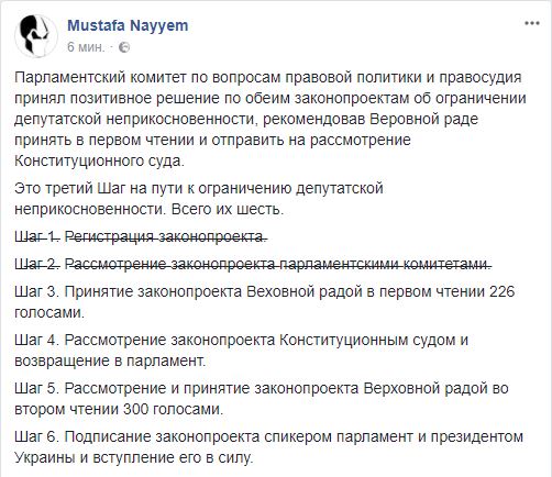 16:42  Парламентский комитет по вопросам правовой политики и правосудия одобрил оба законопроекта об ограничении депутатской неприкосновенности, рекомендовав Верховной Раде принять в первом чтении и отправить на рассмотрение Конституционного суда.
