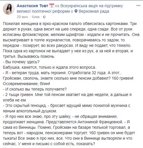 - Я про них все знаю, про эту шайку, - не обращая внимания, продолжает женщина. Представляется Антониной Францевной. - Я сама из Винницы. Помню, Гройсман на базаре тюлькой торговал, а теперь вот - народом, пенсионерами торгует. 160 гривен он мне будет тыкать! Все знаю я про них, все. Что они в Виннице вытворяли и что сейчас. У меня и письмо с собой есть, показать?