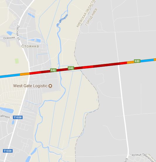 9:36  Житомирская трасса и правда на въезде в Киев темно-красная от пробки.