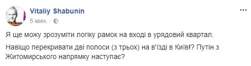 9:31  По данным антикоррупционного активиста Виталия Шабунина, житомирская трасса на въезде в Киев частично перекрыта - работает только одна полоса из трех.