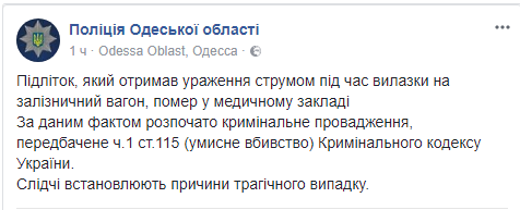 В Одесской области 17-летний парень залез на вагон поезда и умер от удара током. Об этом сообщает пресс-служба областной полиции в Facebook.