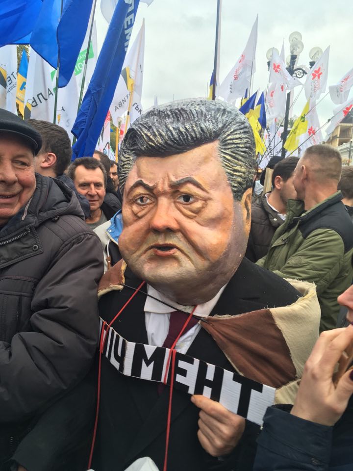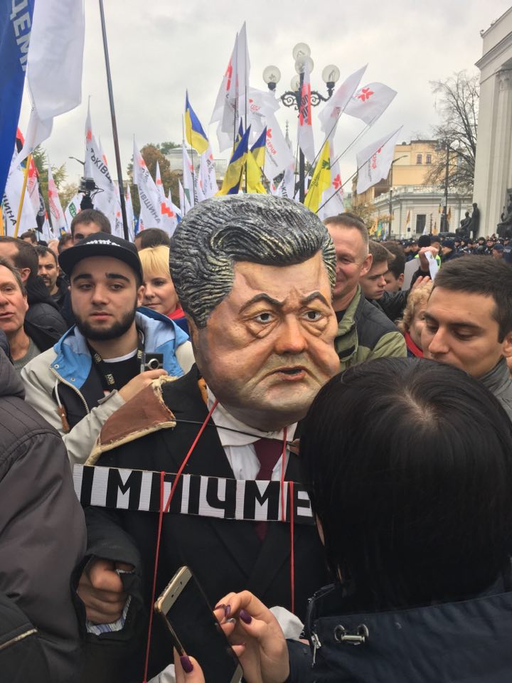 Сегодня, 17 октября, в толпе митингующих активистов под Верховной Радой появился человек в маске президента Петра Порошенко. Об этом сообщает корреспондент "Страны".
