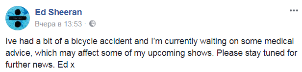 "Я попал в небольшую аварию с велосипедом, в настоящее время я жду рекомендаций врача, которые могут повлиять на некоторые предстоящие шоу с моим участием", - сообщил Эд Ширан.