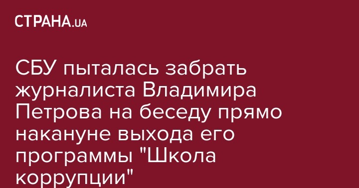 Журналист, автор и ведущий программы "Школа коррупции" Владимир Петров рассказал, что сегодня в его студию Lumpen productione вошли семеро сотрудников СБУ, в том числе один полковник. Сотрудники СБУ сказали, что хотят пообщаться в здании СБУ на улице Владимирской, но готовы подождать конца записи передачи "Школа коррупции".