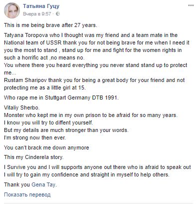 "Татьяна Торопова, которую я считала своей подругой и товарищем по сборной СССР, спасибо тебе, что ты не набралась храбрости, когда мне нужно было, чтобы ты постояла за меня и поборолась за права женщин в такой ужасной ситуации. Нет значит нет. Ты была там и все слышала, но ничего не сделала, чтобы защитить меня...