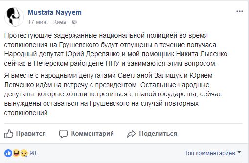 "Я вместе с народными депутатами Светланой Залищук и Юрием Левченко идем на встречу с президентом. Остальные народные депутаты, которые хотели встретиться с главой государства, сейчас вынуждены оставаться на Грушевского на случай повторных столкновений", - написал он.
