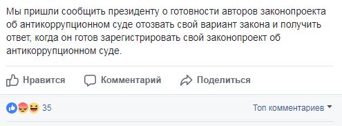 "Глава государства пытается снять с себя ответственность и не публично, через разных представителей предлагает парламенту создать рабочую группу, которая как подсказывает опыт, затянет принятие решения на неопределённое время, - написал Мустафа Найем. - Мы пришли сообщить президенту о готовности авторов законопроекта об антикоррупционном суде отозвать свой вариант закона и получить ответ, когда он готов зарегистрировать свой законопроект об антикоррупционном суде".