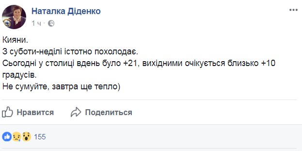 "С субботы-воскресенья существенно похолодает. Сегодня в столице днем было +21, выходные ожидается около 10 градусов. Не унывайте, завтра еще тепло", - написала она.