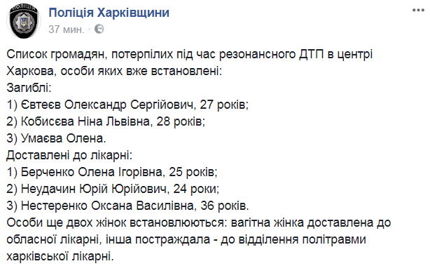 Полиция опубликовала первый список имен жертв кровавого ДТП в центре Харькова