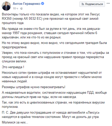 "Мы правда не знаем кто был за рулем в тот день, эта же девушка-мажор 1997 года рождения, ставшая причиной гибели 6 харьковчан, или же кто-то из ее родных", - написал Геращенко.