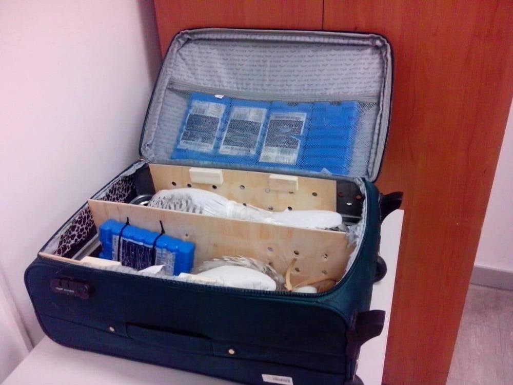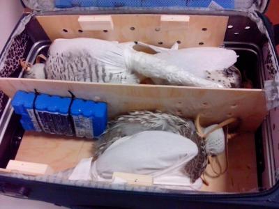 Судя по фото, соколов мужчина связал, закрыл клювы и спрятал в квадратном ящике внутри обычного туристического чемодана.