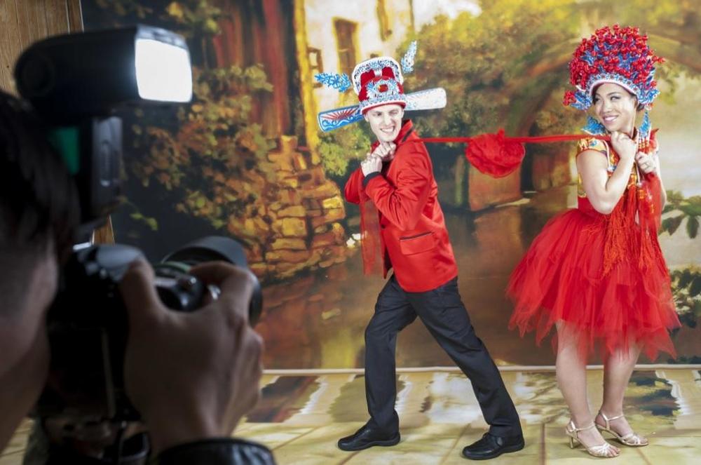 Одна из пар для фотографирования выбирает боксерские перчатки. На голове у нее - корона с длинными кистями, на спине у него - ангольские крылья на пружинах, поэтому они прыгают то вверх, то вниз. У обоих на голове - китчевые версии китайских причесок.