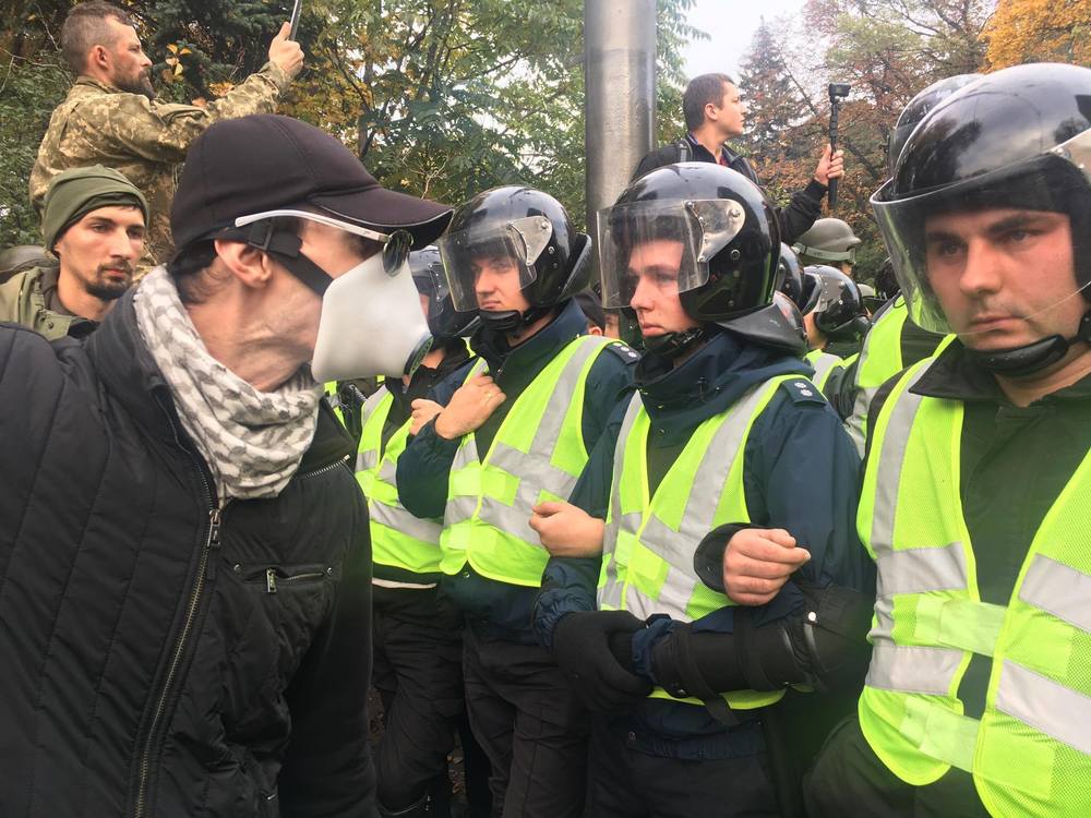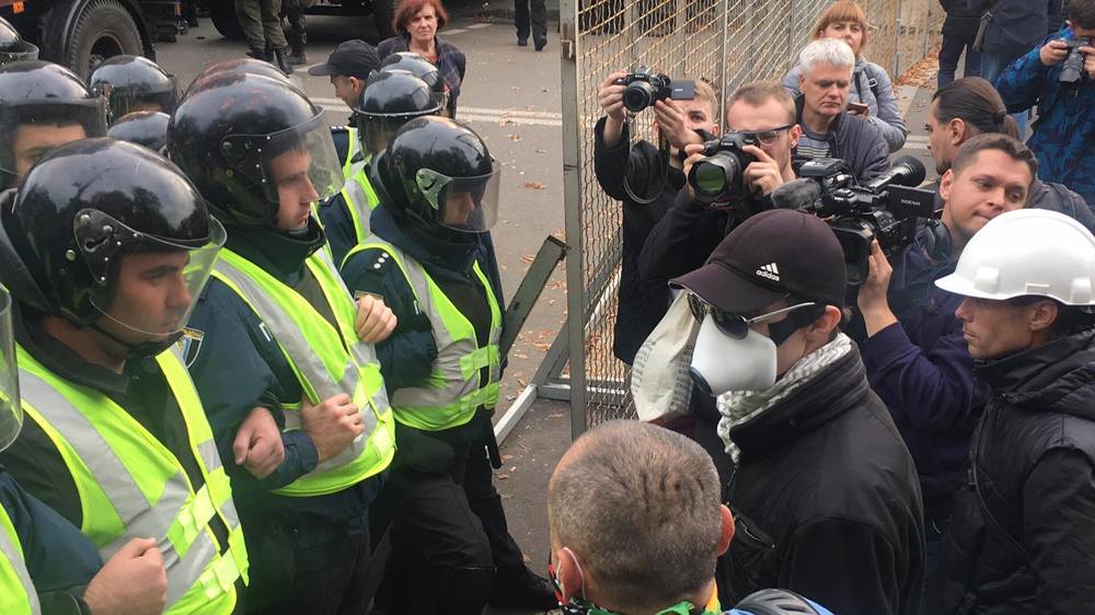 "Кричат "Слава Украине" и барабан по щитам, нагнетая таким образом обстановку", - передает наш корреспондент.