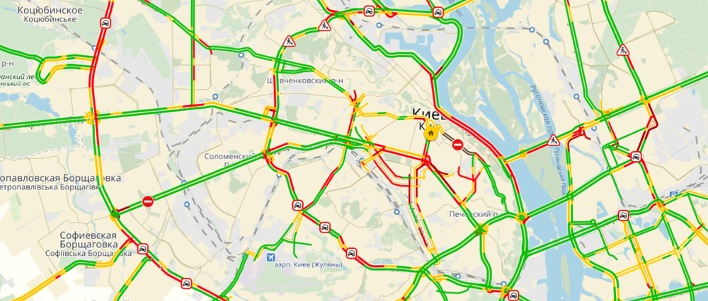 К 19:19 четверга, 19 октября пробки в Киеве достигли 8 баллов. Движение затруднено из-за многочисленных ДТП и дорожных работ.