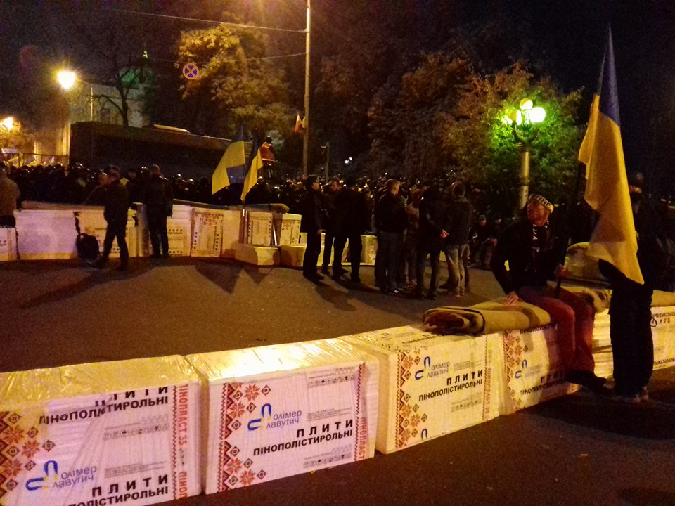 Под Верховной Радой на подходе к палаточному городку МихоМайдана протестующими пытаются пронести строительные плиты из пенопласта, которые укладывают на пол палаток для утепления, но полиция не пропустила их.