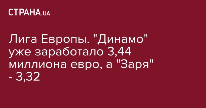 Итак, сколько же заработали "Динамо" и "Заря" после трех туров Лиги Европы. Киевляне пополнят свой счет на 3, 44 миллиона евро, а "Заря" - на 3, 32 миллиона.