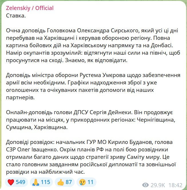 По его словам, основной доклад на Ставке делал главком ВСУ Сырский, который прибыл из Харьковской области.