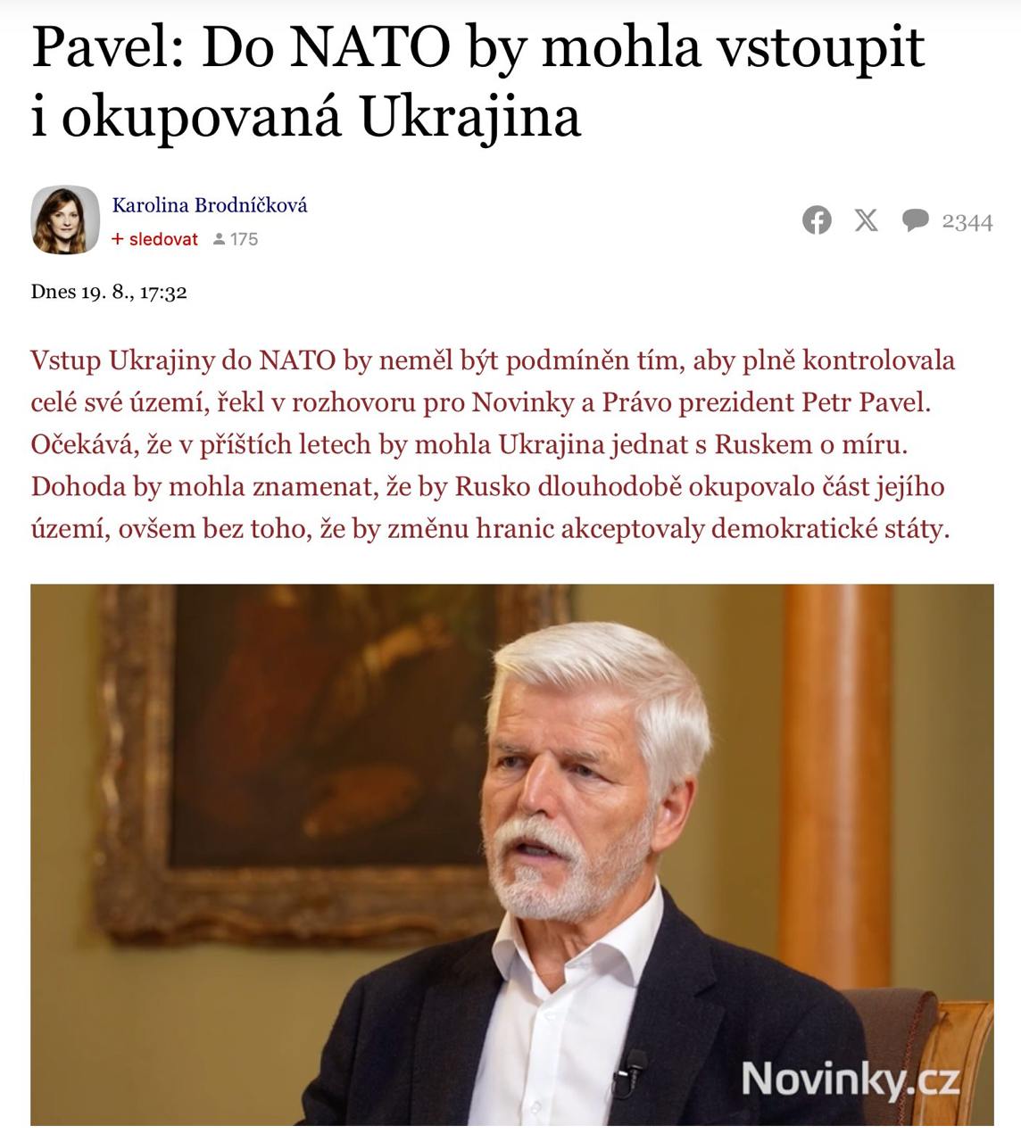 «Я думаю, что полное восстановление контроля над всей территорией не является необходимым условием. Если будет демаркация, даже какой-то административной границы, то мы можем принять эту административную границу как временную и принять Украину в НАТО на той территории, которую она будет контролировать на тот момент», – считает Петр Павел.