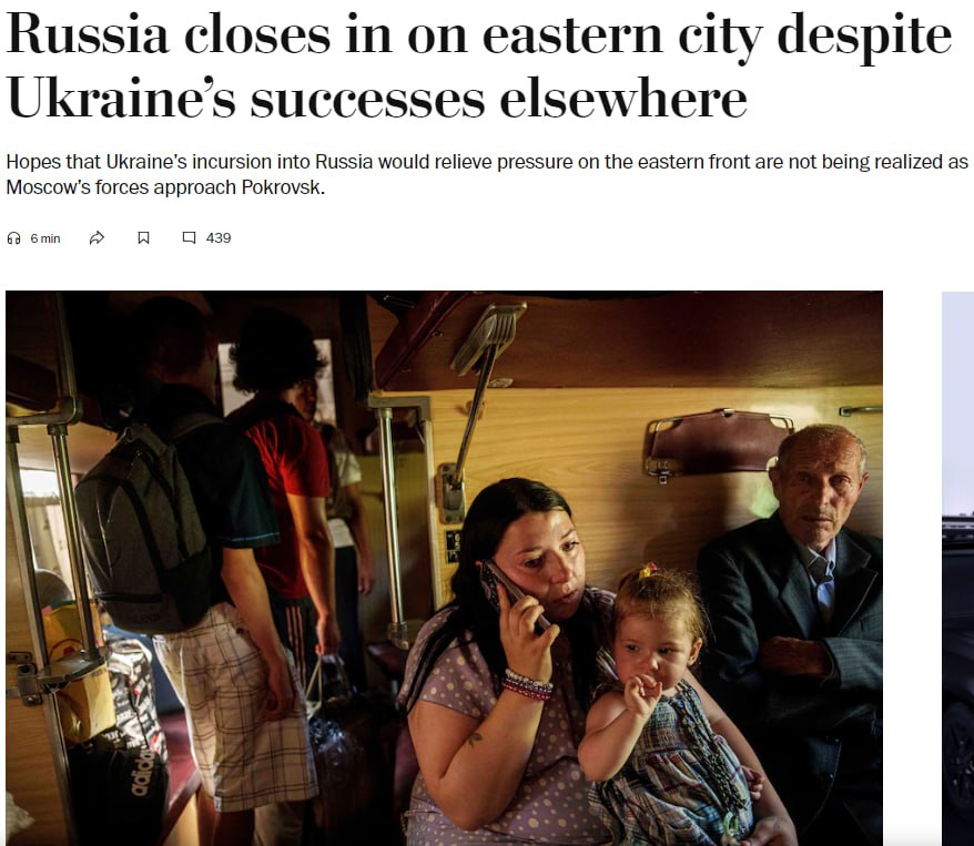 В статье под таким название The Washington Post пишет, что успехи, достигнутые Украиной в ходе двухнедельного наступления на территорию России, не остановили продвижение российских войск в восточной части страны. Это привело к эвакуации Покровска.