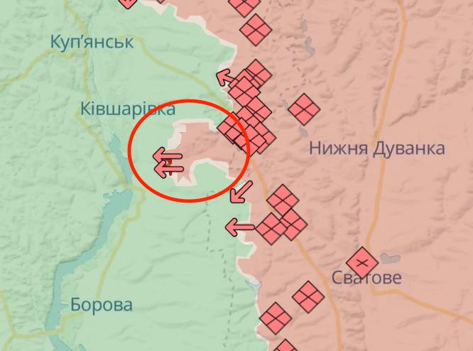 "Если ничего не поменяется, а я пока не вижу к тому каких-то оснований, противник, очевидно, в течение какого-то ближайшего времени сумеет выйти на левый берег реки Оскол на отрезке Глушковка - Кругляковка и таким образом разрежет наш плацдарм на р.Оскол на две части: меньшую, северную (Купянскую) и большую, южную (Боровая)", - комментирует Машовец.