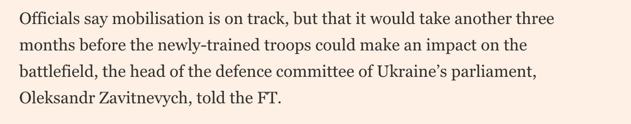 10.30 Мобилизация в Украине "идет по плану, однако пройдет еще три месяца, прежде чем недавно обученные войска смогут оказать влияние на поле боя".