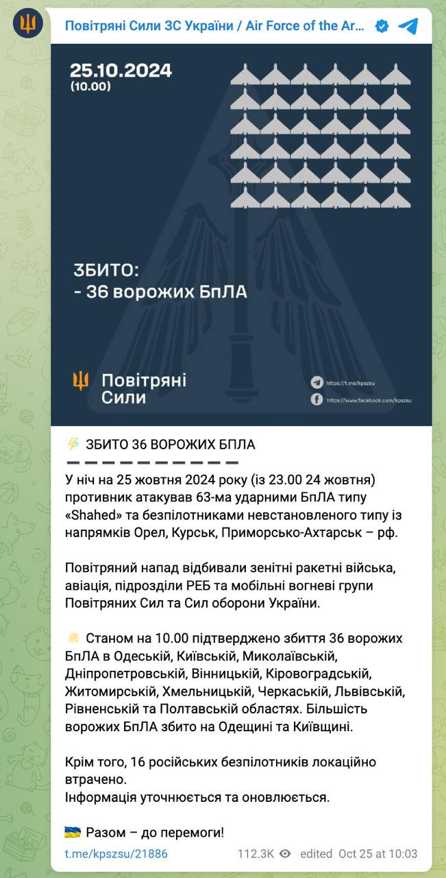 10.11 Воздушные силы сообщают, что ночью сбили 36 "Шахедов" из 63.