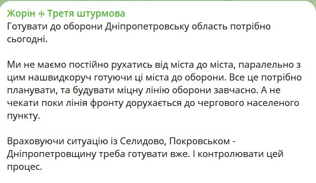 "Готовить к обороне Днепропетровскую область нужно сегодня. Мы не должны постоянно двигаться от города к городу, параллельно с этим наскоро готовя эти города к обороне. Все это нужно планировать, и строить прочную линию обороны раньше времени. А не ждать, пока линия фронта двигается в очередной населенный пункт", – написал Максим Жорин в своем тг-канале.