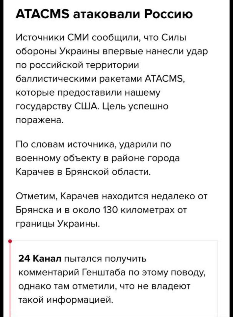 17.00 Американские источники The New York Times подтверждают, что Украина сегодня впервые ударила по территории РФ дальнобойными ракетами ATACMS.