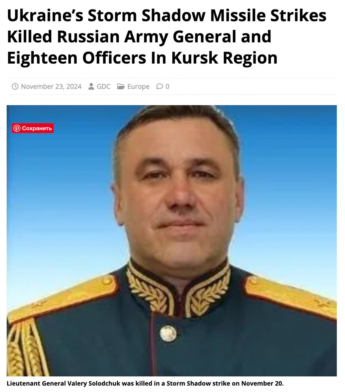 12.22 В результате атаки Storm Shadow по территории Курской области 20 ноября погибли российский генерал-лейтенант Валерий Солодчук, 18 офицеров и 500 северокорейских солдат, утверждает базирующаяся в США корпорация Global Defense Corp со ссылкой на источники.
