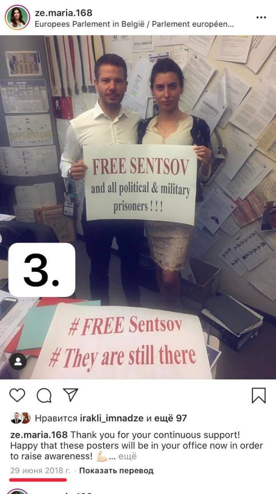 Фото 3 - Мария с сострадающим лицом стоит с плакатом «Free Sentsov» в Европарламенте. Благодарит европарламентариев за поддержку в борьбе против Кремля.