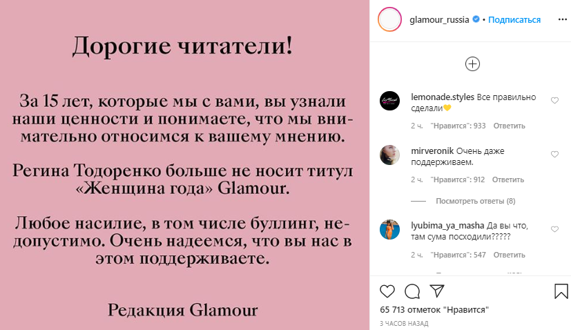 Однако модное издание Glamour решило лишить Регину звания "Женщина года". "Дорогие читатели! За 15 лет, которые мы с вами, вы узнали наши ценности и понимаете, что мы внимательно относимся к вашему мнению. Регина Тодоренко больше не носит титул "Женщина года" Glamour. Любое насилие, в том числе буллинг, недопустимо. Очень надеемся, что вы нас в этом поддерживаете" - сделала заявление редакция.