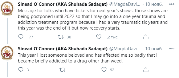 Исполнительница добавила, что лечение начнет на следующей неделе. Оно продлится около года. Шинейд заявила, что концерты, запланированные на 2021 год, перенесла на 2022-й. Певица также сообщила, что перед отъездом выпустит "бессмысленный альбом". Выход ее биографической книги запланирован на июнь следующего года.