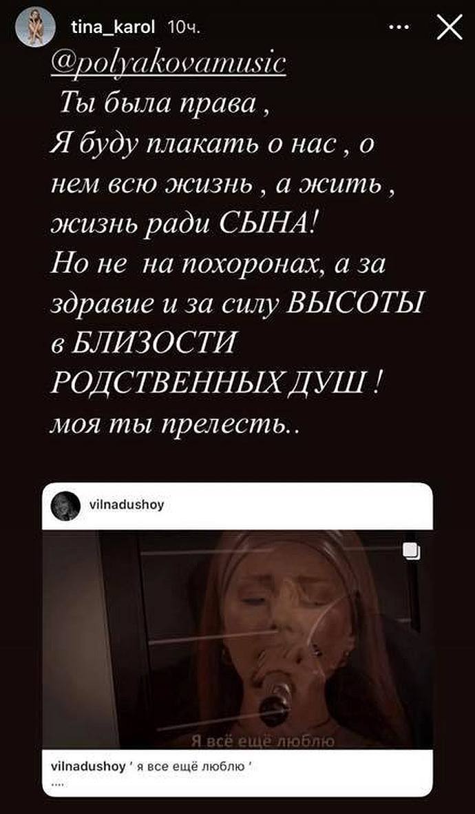 "Я действительно думаю, что в последнее время у Тины очень грустный репертуар. Но саму артистку Тину Кароль я очень люблю, уважаю. И никогда бы не стала шутить на тему ее личной трагедии, истории. И всех, кого это оскорбило и зацепило, я искренне прошу прощения. А к режиссерам монтажа у меня отдельная просьба, ну если вы видите, что что-то идет, не так и может быть интерпретировано неверно, то вырезайте, вы же и так много хорошего вырезаете" - пояснила Полякова в видео на своей странице в Instagram.