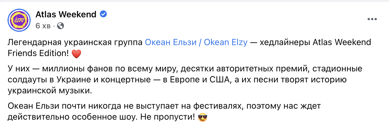 "Легендарная украинская группа "Океан Эльзы" - хедлайнеры Atlas Weekend Friends Edition! У них - миллионы фанов по всему миру, десятки авторитетных премий, стадионные солдауты в Украине и концертные - в Европе и США, а их песни творят историю украинской музыки. Океан Эльзы почти никогда не выступает на фестивалях, поэтому нас ждет действительно особенное шоу. Не пропусти!" - говорится на странице мероприятия в Facebook.