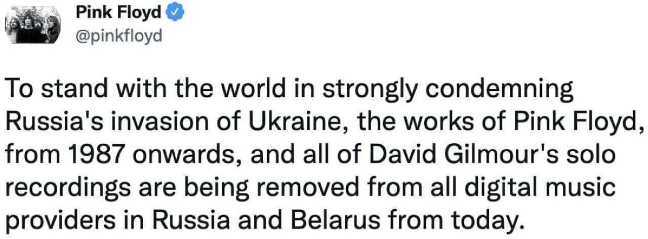 Легендарная британская рок-группа Pink Floyd заявила, что удаляет всю свою музыку, начиная с 1987-го года, а также сольные треки Дэвида Гилмора, из цифровых платформ в России и Беларуси в знак протеста против вторжения армии РФ в Украину.