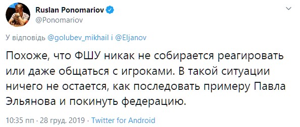 "Похоже, что Федерация шахмат Украины никак не собирается реагировать или даже общаться с игроками. В такой ситуации ничего не остается, как последовать примеру Эльянова и оставить федерацию", - написал он.